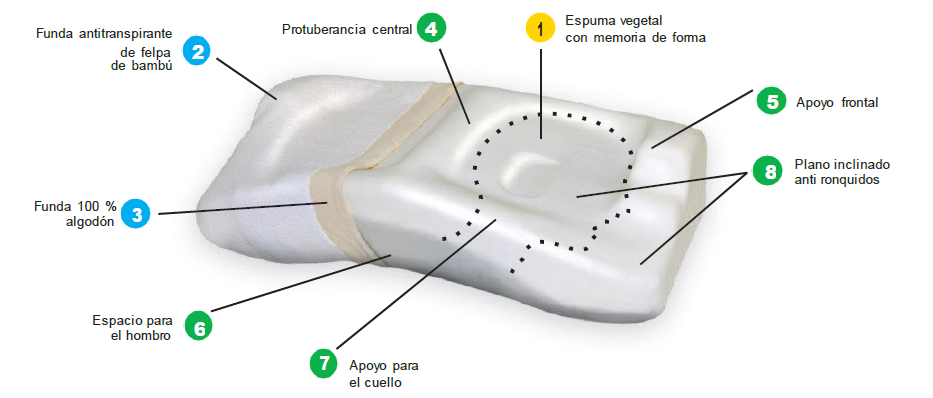 La forma de esta almohada incita a dormir de lado con la cabeza ligeramente inclinada hacia abajo. En esta posición, la lengua queda adelantada por la gravedad, lo que crea espacio en la faringe y facilita una buena respiración.