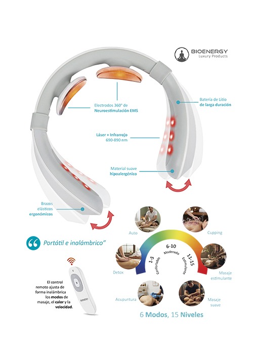 Se puede seleccionar cada función por separado, con 6 modos de masaje, 15 niveles de intensidad y calor hasta 42° C. La aplicación del dispositivo Láser Cervical Profesional es fácil y sencilla, y el tratamiento puede hacerse varias veces al día. Esta terapia tiene efectos inmediatos antiinflamatorios y analgésicos, reduciendo dolor cervical y de cuello, migrañas, y produciendo un efecto de relajación articular y muscular, lo que supone un avance sin precedentes a nivel doméstico.
