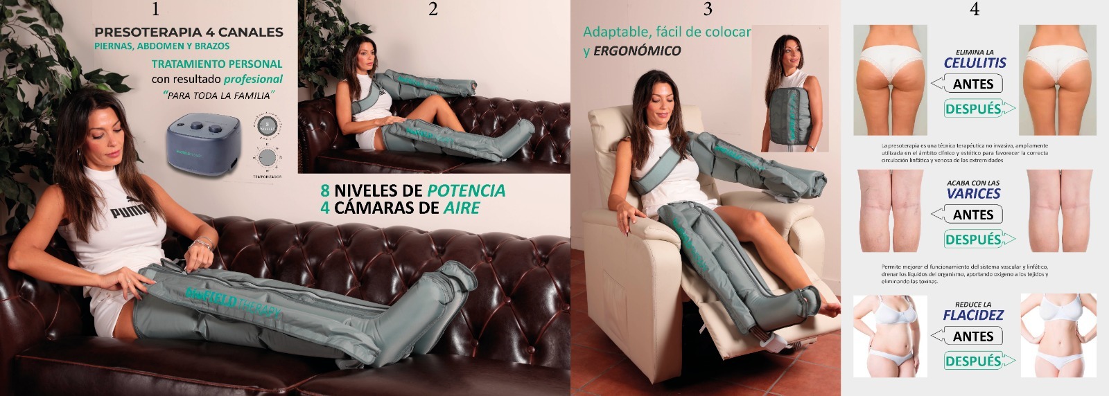 • La presoterapia es una técnica indolora y su aplicación proporciona al organismo importantes beneficios, ya que ayuda a que el sistema circulatorio se active, la piel luzca mejor y se favorezca la eliminación de toxinas, fortaleciendo además músculos y articulaciones.